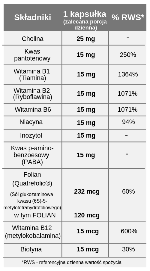 Składniki: Cholina, Kwas pantotenowy (D-pantotenian wapnia), Tiamina (chlorowodorek tiaminy), Witamina B2 (Ryboflawina), Witamina B6 (pirydoksalo-5-fosforan), Niacyna (kwas nikotynowy), Inozytol, Kwas p-aminobenzoesowy (PABA),substancja wypełniająca (celuloza mikrokrystaliczna), Folian (Sól glukozaminowa kwasu (6S)-5-metylotetrahydrofoliowego), Witamina B12 (metylokobalamina), Biotyna (D-biotyna), substancja glazurująca: hydroksypropylometyloceluloza.